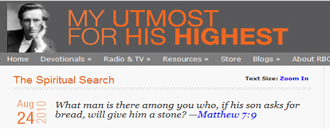 The illustration of prayer that our Lord used here is one of a good child who is asking for something good. We talk about prayer as if God hears us regardless of what our relationship is to Him (seeMatthew 5:45 ). Never say that it is not God’s will to give you what you ask. Don’t faint and give up, but find out the reason you have not received; increase the intensity of your search and examine the evidence. Is your relationship right with your spouse, your children, and your fellow students? Are you a “good child” in those relationships? Do you have to say to the Lord, “I have been irritable and cross, but I still want spiritual blessings?” You cannot receive and will have to do without them until you have the attitude of a “good child.” We mistake defiance for devotion, arguing with God instead of surrendering. We refuse to look at the evidence that clearly indicates where we are wrong. Have I been asking God to give me money for something I want, while refusing to pay someone what I owe him? Have I been asking God for liberty while I am withholding it from someone who belongs to me? Have I refused to forgive someone, and have I been unkind to that person? Have I been living as God’s child among my relatives and friends? (see Matthew 7:12 ). I am a child of God only by being born again, and as His child I am good only as I “walk in the light” ( 1 John 1:7 ). For most of us, prayer simply becomes some trivial religious expression, a matter of mystical and emotional fellowship with God. We are all good at producing spiritual fog that blinds our sight. But if we will search out and examine the evidence, we will see very clearly what is wrong— a friendship, an unpaid debt, or an improper attitude. There is no use praying unless we are living as children of God. Then Jesus says, regarding His children, “Everyone who asks receives . . .” ( Matthew 7:8 ). |