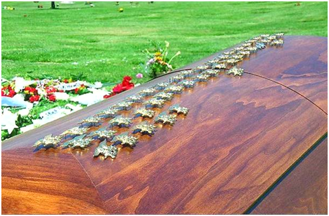 Now for those who don’t know what a Trident Pin is, here is the definition: After one completes the basic Navy Seals Program which lasts for three weeks, and is followed by Seal Qualification Training, which is 15 more weeks of training necessary to continue improving basic skills and to learn new tactics and techniques, required for an assignment to a Navy Seal platoon. After successful completion, trainees are given their naval enlisted code, and are awarded The Navy Seal Trident Pin. With this gold pin they are now officially Navy Seals! It was said that you could hear each of the 45 slaps from across the cemetery! By the time the rosewood casket reached the grave site, it looked as though it had a gold inlay from the 45 Trident Pins that lined the top.