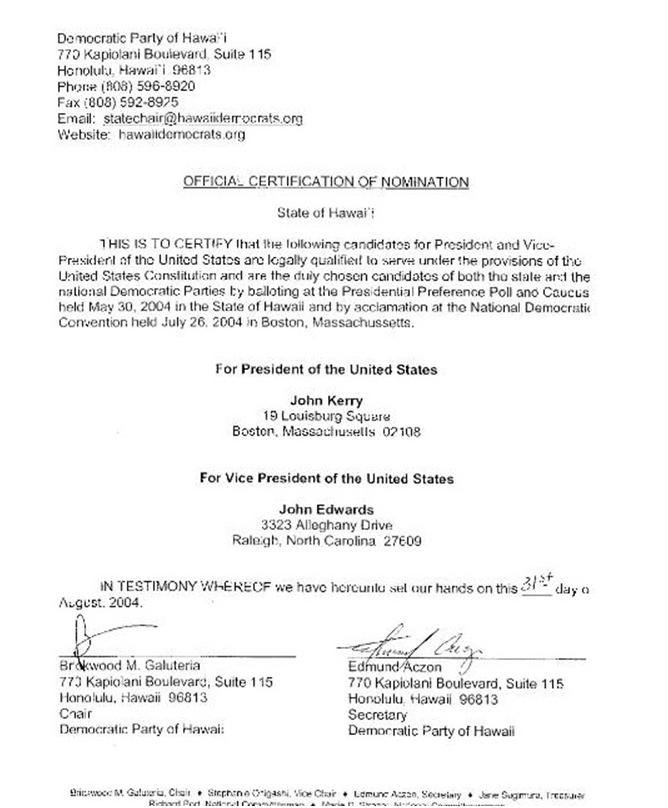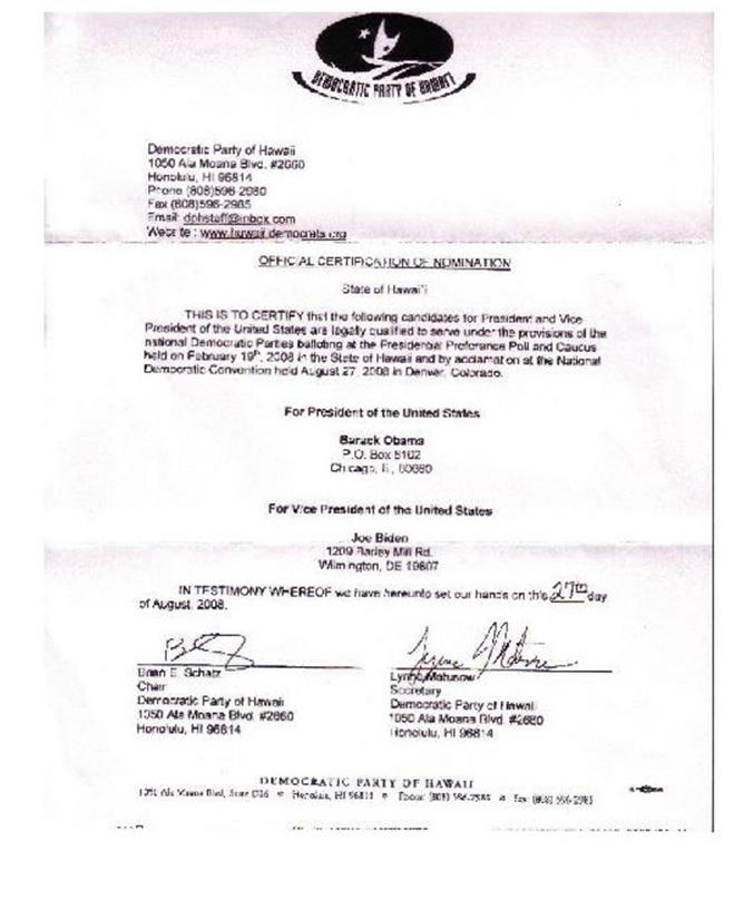 “What the Democratic Party of Hawaii’s 2008 Certification of Nomination left out are these words: ‘of the United States Constitution and are the duly chosen candidates of both the state and,'” the blogger wrote.