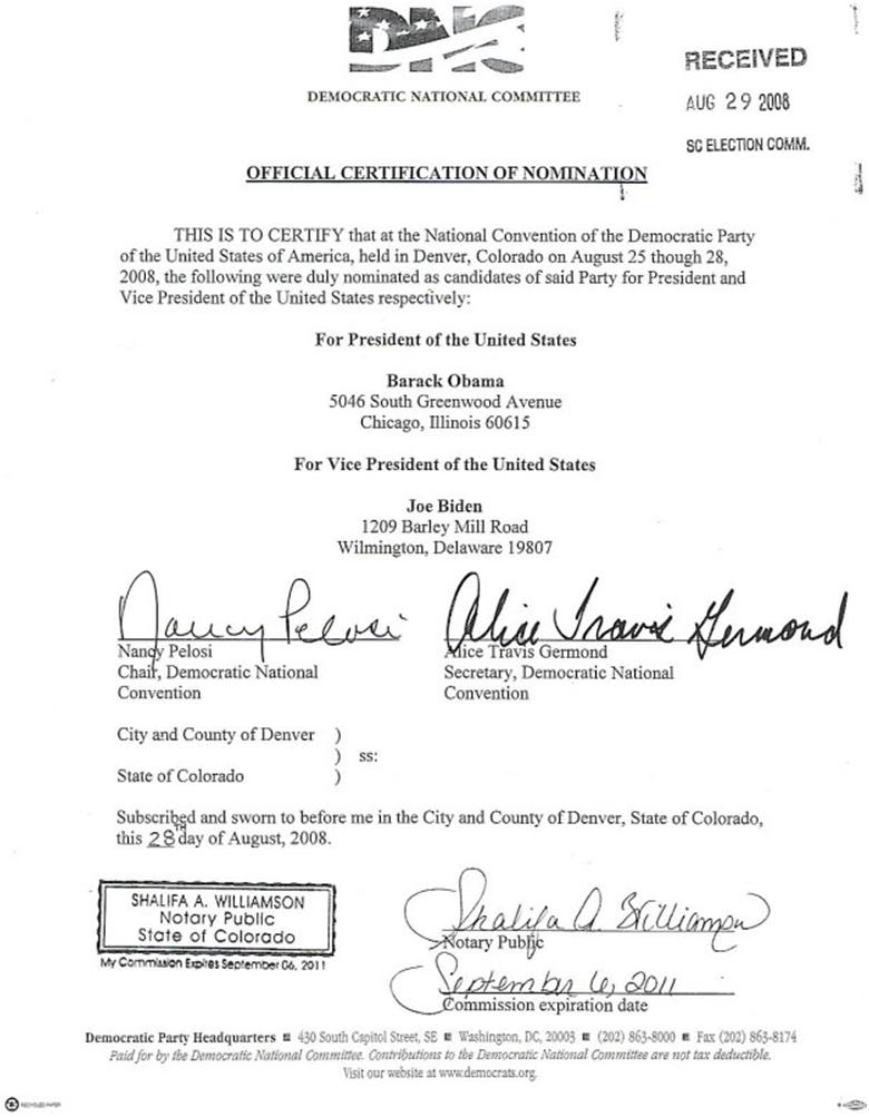One image of the certification for Barack Obama’s nomination, including the affirmation Obama and Joe Biden “are legally qualified to serve under the provisions of the United States Constitution”
